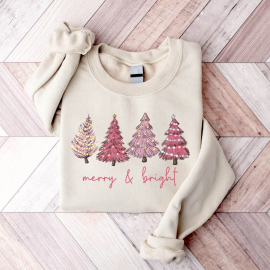 Merry & Bright Pink Christmas Trees Sweatshirt, Cute Christmas Sweatshirt, Women’s Holiday Sweater, Winter Sweatshirt, Christmas Shirt