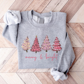 Pink Merry and Bright Christmas Tree Sweatshirt, Cute Women Christmas Crewneck, Holiday Sweatshirt, Winter Sweatshirt, Christmas Sweater